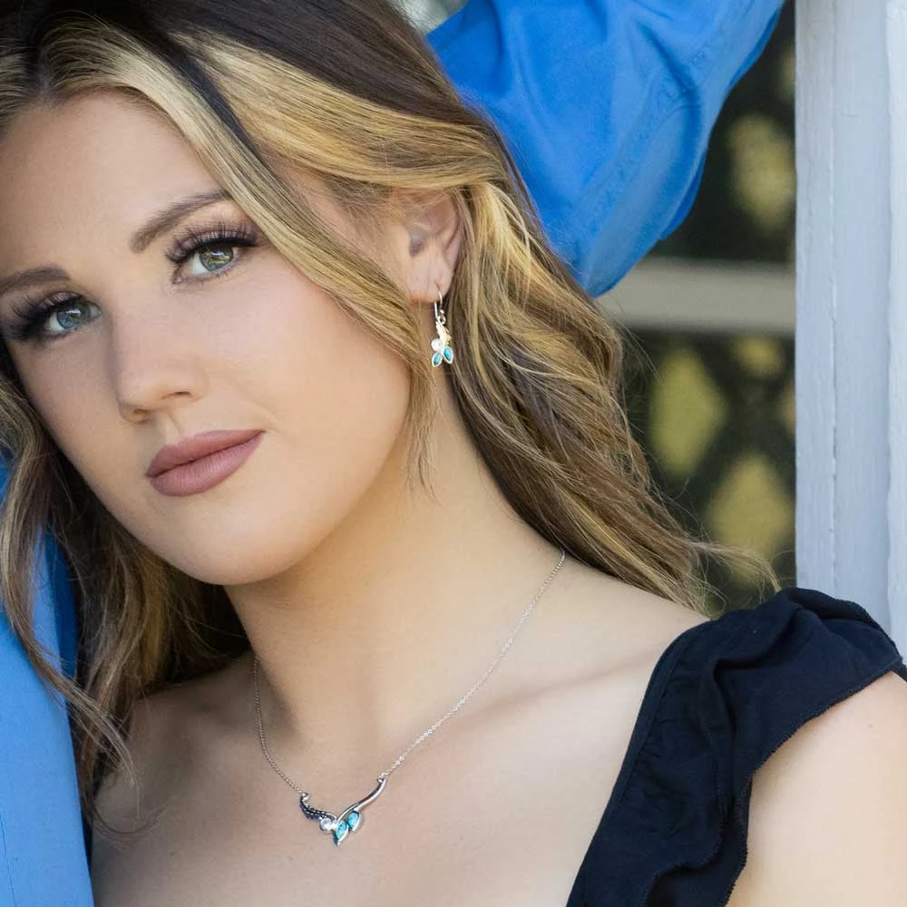 - On the other side of the necklace, a silver-tone piece wraps into the center towards two almond-shaped turquoise stones to complete the stunning design.