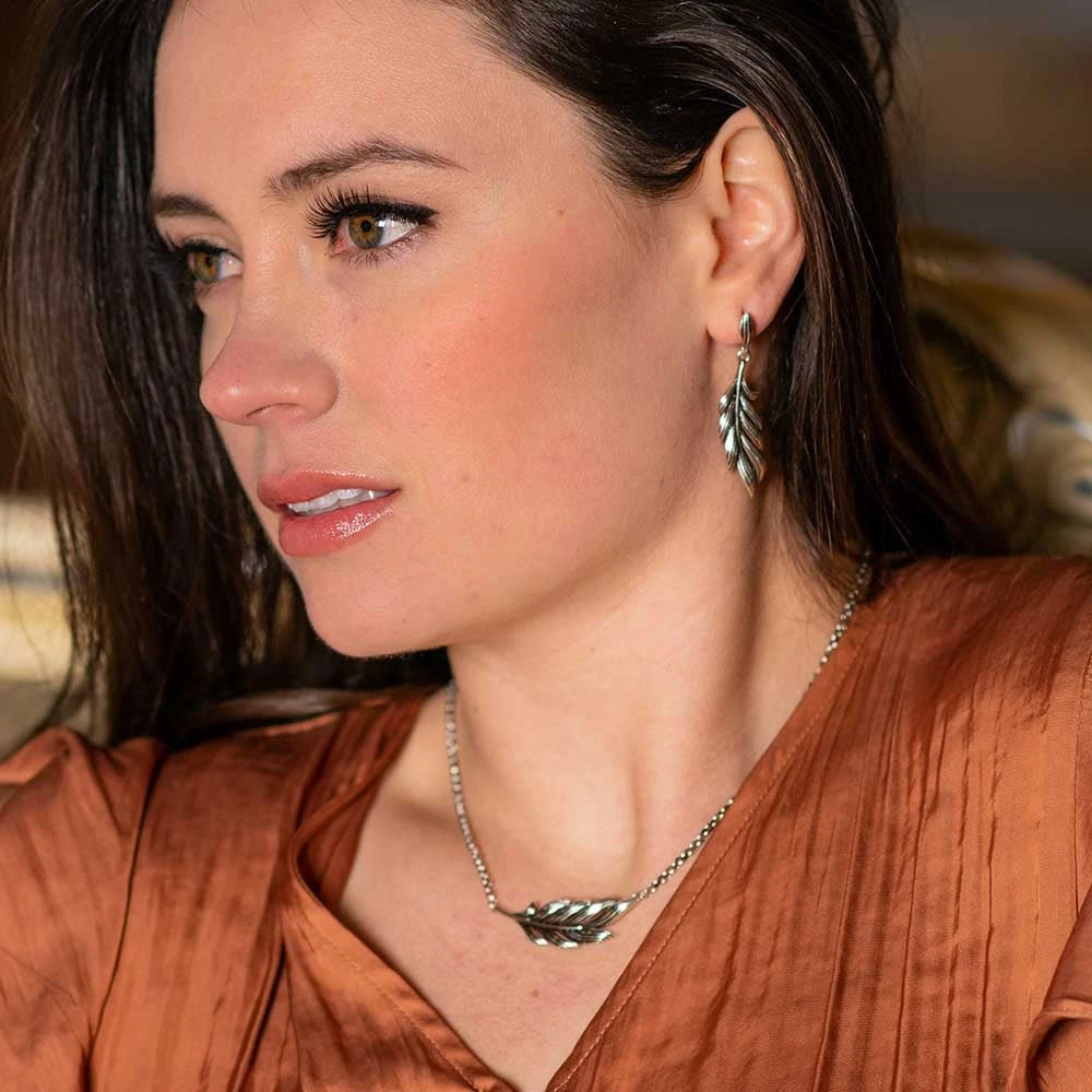 - Silver finished pendant style feather jewelry set with earrings and a necklace that holds hand painted black between the feather strands